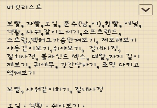누나에게 보여준 리스트다. 누나는 미소를 지었다. 나는 누나에게 이걸 보여주는 자체가 행복이었다. 누나는 가장하고 싶은 것을 3가지 고르라고 했다. 나는 보빨, 샤워 같이하기, 질내 사정을 골랐고, 누나는 오일, 역할, 쉬야 보기를 골랐다. 우리는 누나의 선택에 따르기로 합의를 했다.