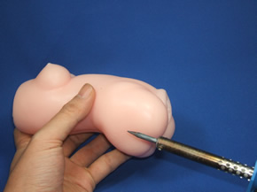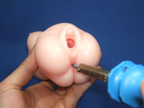 '시타츠키노 온나'와 같은 제품은 진동기능이 따로 있지는 않더라도 처음부터 진동기를 장착할 수 있는 장착구멍이 있으므로, 로터 장착이 간단하지만, 다른 핸드잡에도 진동시키고 싶었기 때문에, 장착구멍을 열도록 해보았습니다. 구멍을 열기 위해서는 전기 인두를 사용했습니다.